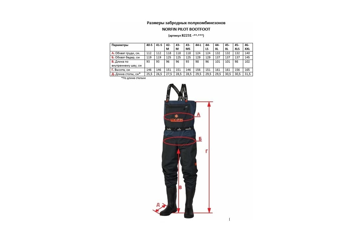 Технические характеристики забродного полукомбинезона Norfin PILOT BOOTFOOT с сапогами р.45/XLS 82231-45-XLS
