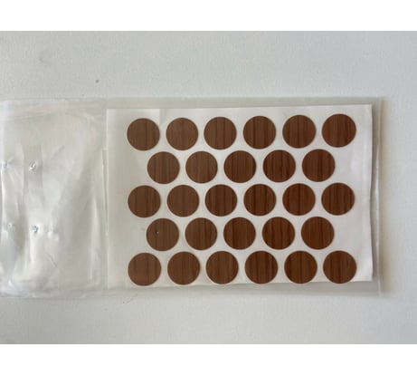 Обратите внимание, что заглушки всё-таки немного фактурные. С одной стороны, смотрится лучше, немного имитируя структуру дерева. Однако клеевая способность незначительно снижается. В наборе действительно пятьдесят самоклеек. Оттенок изделий немного отличается от иллюстраций к товару (см. фото). Диаметр соответствует описанию: 14мм. Толщина материала: 0.25мм (включая клеевой слой). Судя по плотности, действительно меламин. Все изделия пришли целые. Лист с самоклейками согнут аккуратно.