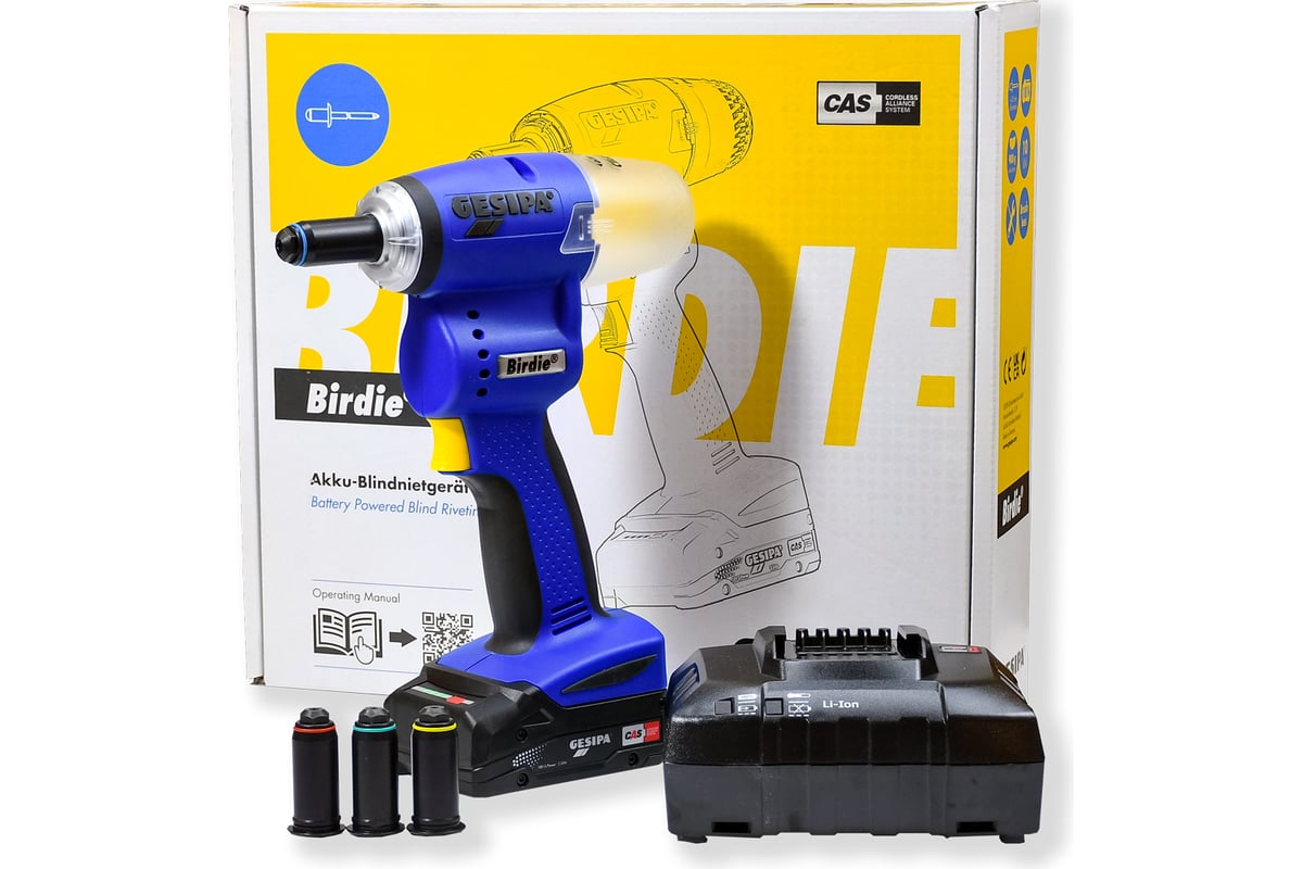 Заклепочник Birdie – это новейший заклёпочник от немецкой компании Gesipa. К отличительным особенностям этой модели относятся: малый вес, компактный корпус, бесщеточный мотор с высокой энерго эффективностью, способность клепать заклепки любого материала диаметром до 5 мм.
