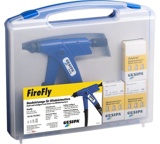 Заклепочник FireFly box - предназначен для установки заклёпок-гаек. Заклепочник упакован в прозрачный пластиковый кейс, удобный для переноски, и укомплектованы небольшим количеством заклепок нескольких видов для того, чтобы сразу можно было начать работать. Сделан на базе заклепочника Gesipa Flipper, обладающего специальным храповым механизмом снижающим нагрузку на руки на 40 %, что позволяет работать одной рукой. Благодаря этому установка заклёпок-гаек становится значительно проще, чем при работе обычным ручным заклёпочником.