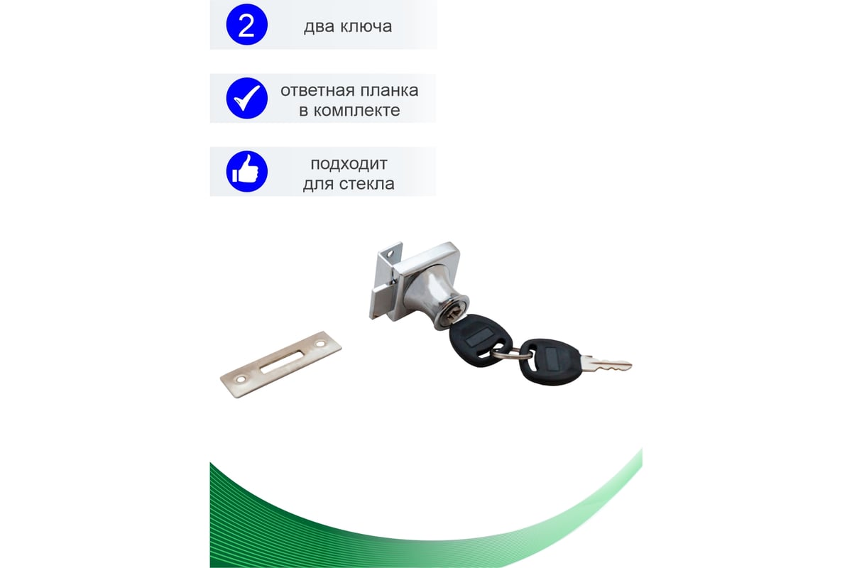 Функциональный и практичный мебельный замок предназначен для запирания стеклянных створок шкафов.