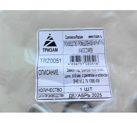 Замок под трехгранный ключ ТРИЗАМ цинк, d-9 мм, с ригелем и ключом ЗЧВ.М.2.79.1066.КМ TRZ0051