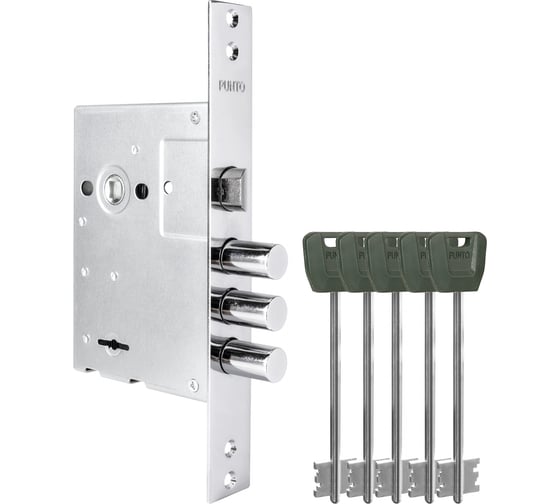 Замок врезной сувальдный Punto MDV30S с тремя ригелями предназначен для установки во входные и технические металлические двери, в качестве основного (нижнего). Стальной оцинкованный корпус.Универсальная реверсивная защелка, подходит для левых и правых дверей. Бэксет- 65 мм. Выход ригелей- 26 мм. Диаметр ригелей -16 мм. В комплект входят: врезной замок, 5 длинных ключа с эргономичной пластиковой головкой для дверей толщиной40-120мм, крепежная фурнитура.