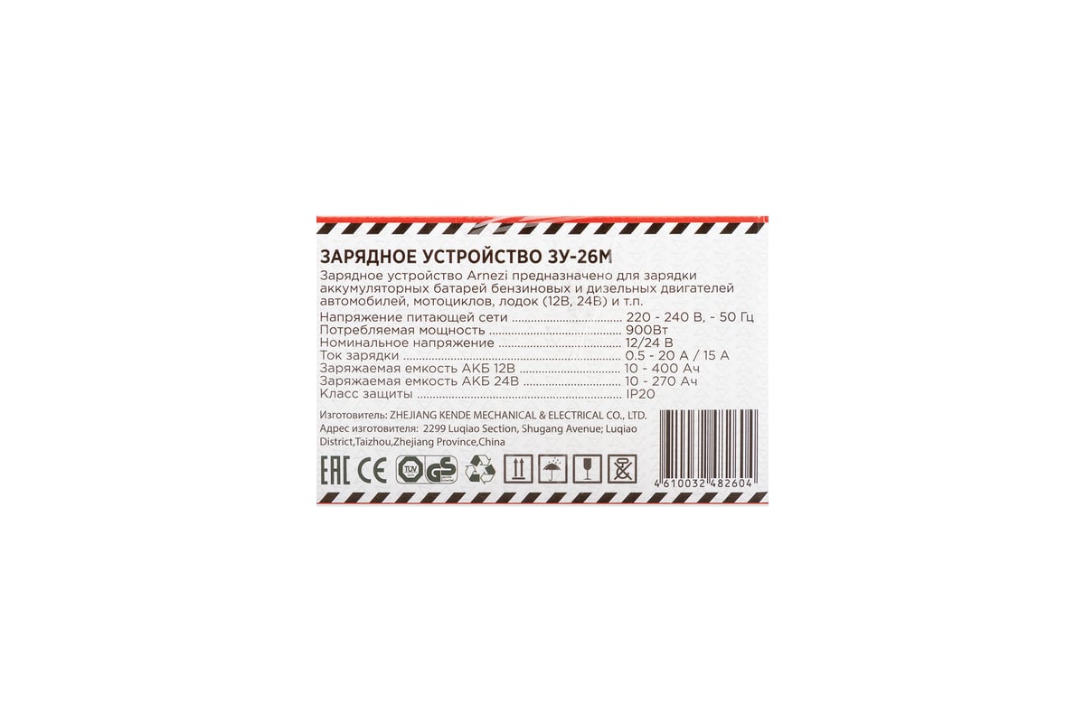Технические характеристики зарядного устройства Arnezi ЗУ-26М R7990107
