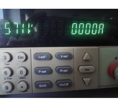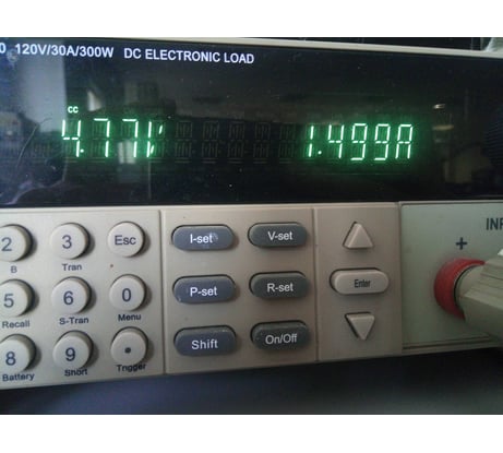 Выход USB (см. фото с цветным дисплеем). Кабель с тонким круглым разъемом под кнопочные телефоны Nokia (см. фото с зелёным дисплеем нагрузки). КПД около 75% при нагрузке = 1А. Есть красный светодиод показывающий наличие входного напряжения.