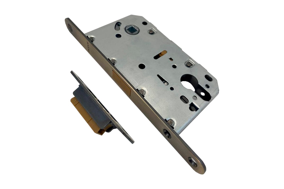 Защелка с фиксацией предназначена для деревянных межкомнатных дверей Устанавливается с ручкой раздельной, цилиндровым механизмом и накладкой под цилиндр Trodos (приобретаются отдельно). Данная модель оснащена магнитным ригелем, что обеспечивает бесшумное закрытие двери. Подходит для запирания левых и правых дверей, открывающихся как внутрь, так и наружу. Стойкое гальваническое покрытие оптимально для использования во влажных помещениях. Межосевое расстояние - 85 мм. Размер сечения квадрата под ручку - 8 мм. Удаление ключевого отверстия (BACKSET) - 50 мм.