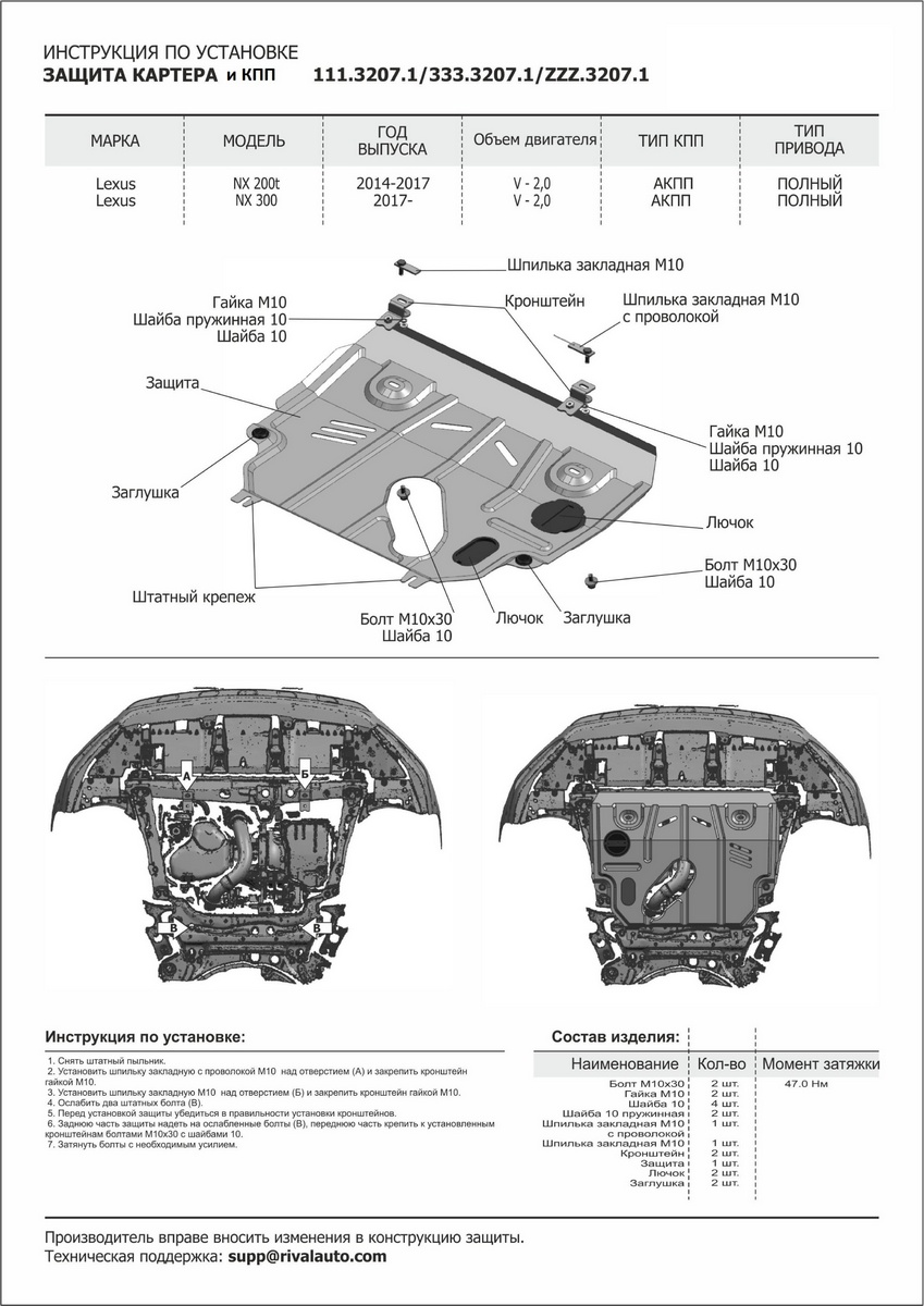 Защита картера и КПП Rival для Lexus NX 200t V - 2.0 238 л.с. 2014-2017/Lexus NX 300 111.3207.1