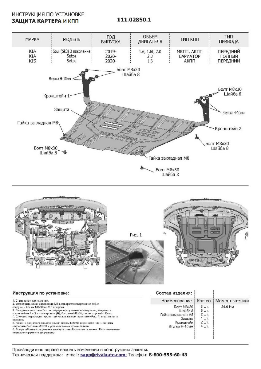 Защита картера + комплект крепежа АвтоБроня Сталь Kia Seltos V-2 0 полный привод 111.02850.1 подходит для: