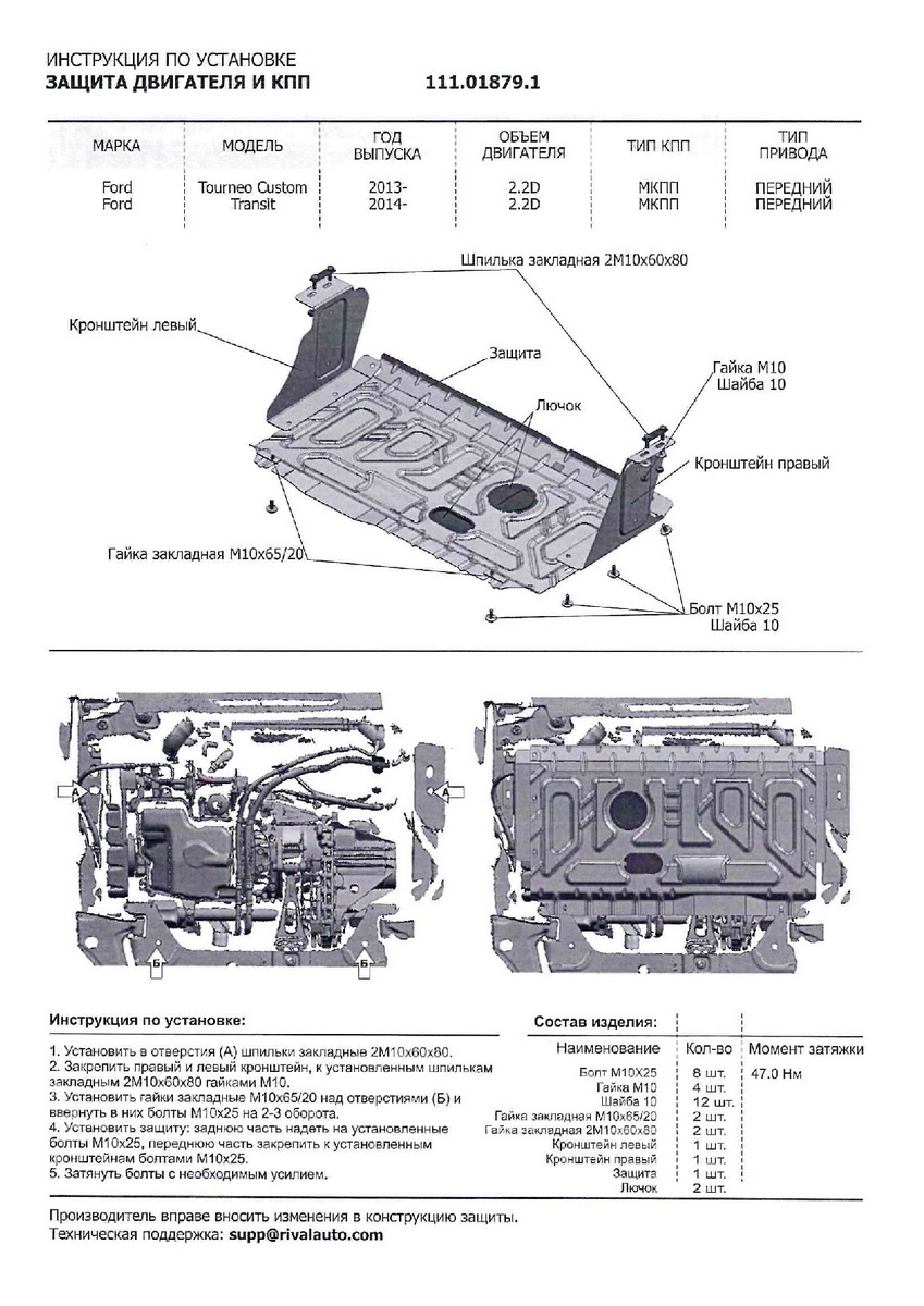 АвтоБроня Защита картера + КПП + комплект крепежа Сталь Ford Tourneo Custom 2017- V - 111.01879.1 подходит для: