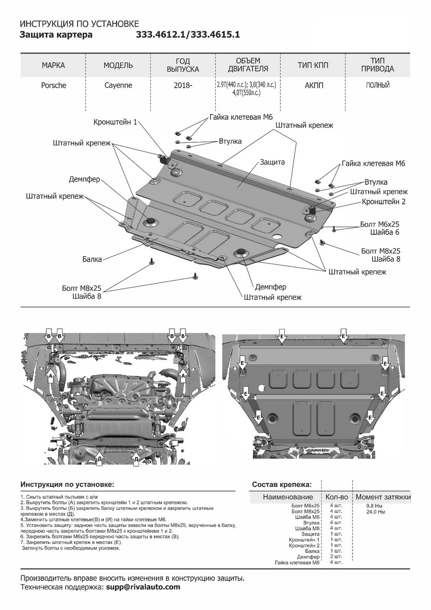 Защита картера Rival (черная) для Porsche Cayenne III 2017-н.в., штампованная, алюминий 4 мм, с крепежом, 333.4615.1