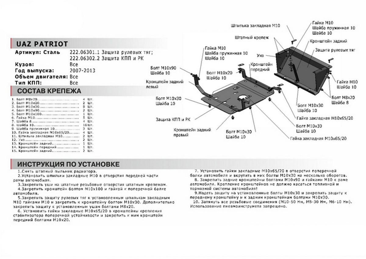 Защита КПП + РК + крепеж АвтоБроня Сталь UAZ Patriot 2007-2013 V - все 222.06302.2 подходит для: УАЗ Patriot (V - все) 2005-2014
