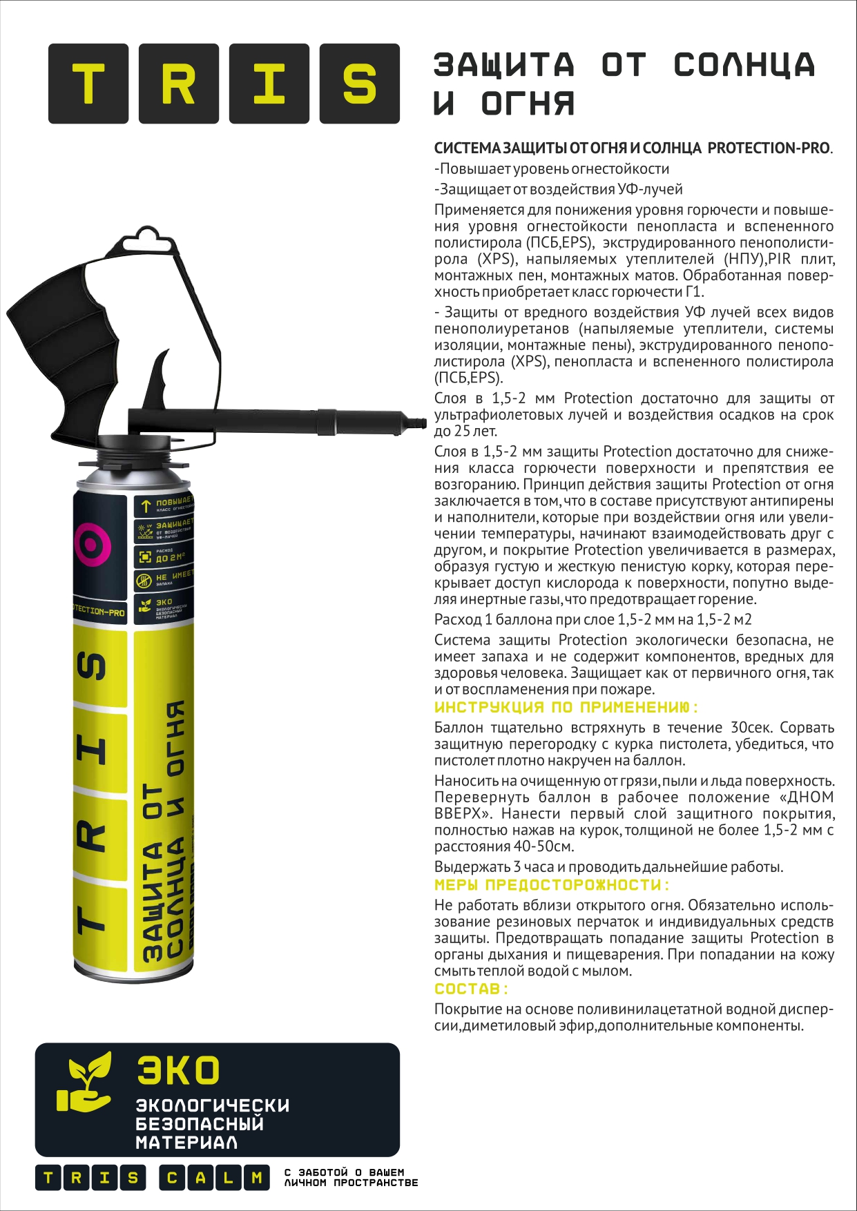 ЗАЩИТА ОТ ОГНЯ И СОЛНЦА "PROTECTION-PRO" (с пластиковым пистолетом в комплекте).-Повышает уровень огнестойкостиПрименяется для:-Понижения уровня горючести и повышения уровня огнестойкости пенопласта и вспененного полистирола, экструдированного пенополистирола ,напыляемых утеплителей (НПУ),PIR плит, монтажных пен, монтажных матов. Обработанная поверхность приобретает класс горючести Г1.-Защиты от вредного воздействия УФ лучей всех видов пенополиуретанов (напыляемые утеплители, системы изоляции, монтажные пены), экструдированного пенополистирола (XPS), пенопласта и вспененного полистирола (ПСБ,EPS).Слоя в 1,5-2 мм "PROTECTION PRO" достаточно для защиты от ультрафиолетовых лучей и воздействия осадков на срок до 25 лет.