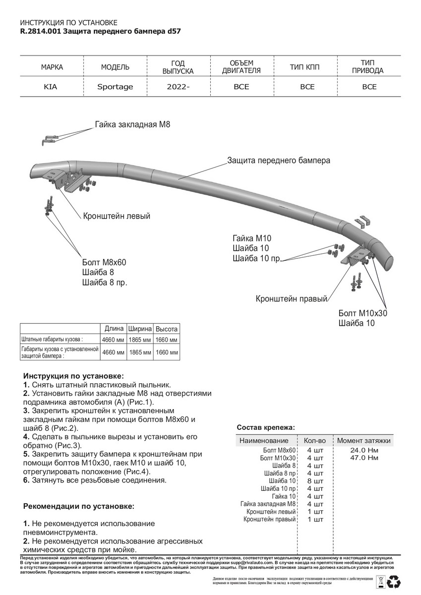 Технические характеристики защиты переднего бампера Rival R.2814.001