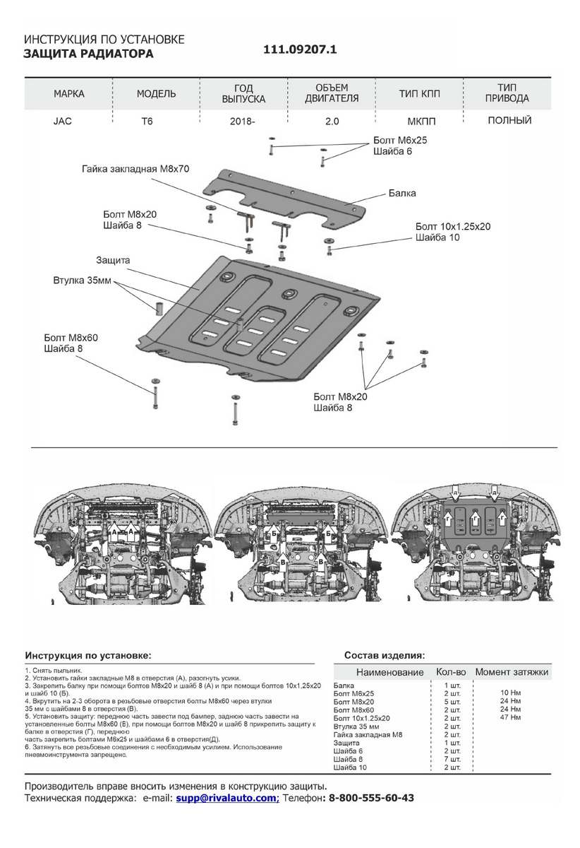 Защита радиатора АвтоБроня JAC T6 2018-н.в./T8 2023-н.в./Sollers ST6 2023-н.в., 111.09207.1