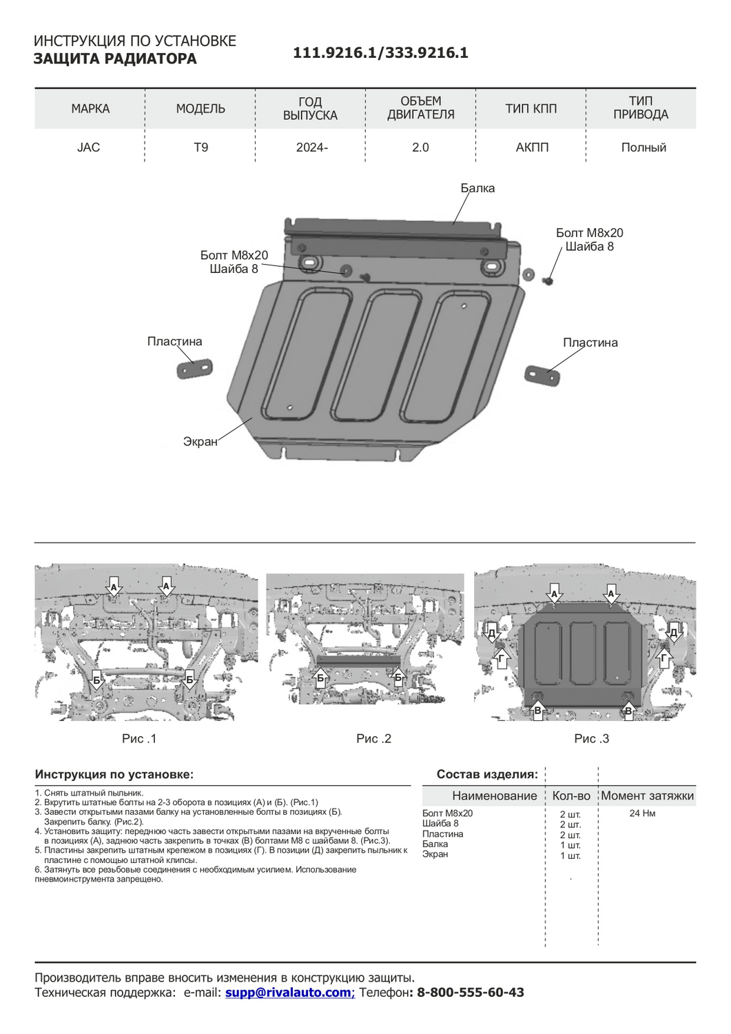 Защита радиатора Rival JAC T9 АКПП 4WD 2024-н.в., рынок РФ, алюминий 3 мм, с крепежом 333.9216.1