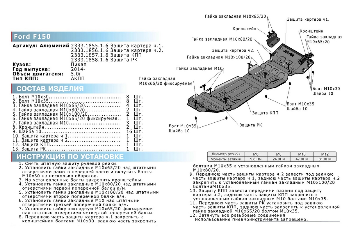 Защита КПП Rival подходит для: Ford F-150 XIII (V - 5.0) 2014-2018 2017-н.в.
