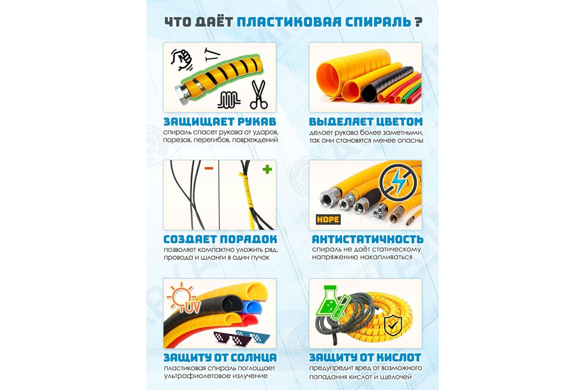 Защищает рукава и шланги от ударов, порезов, перегибов и скручивания. Дает возможность компактно уложить рукава в один пучок, чтобы они не путались и выглядели более эстетично собранными вместе. Яркие цвета спирали, сделают рукава более заметными на технике и станках, чтобы предотвратить их случайное повреждение. Пластиковая спираль, обладая устойчивостью к кислотам и щелочам, защитит шланг от возможного попадания на поверхность едкой среды. Защита будет поглощать ультрафиолетовое излучение, которое оказывает вред материалу рукава, при прямом контакте. Предотвращает скапливание статического электричества на рукавах и фитингах, связанных в пучки проводах.