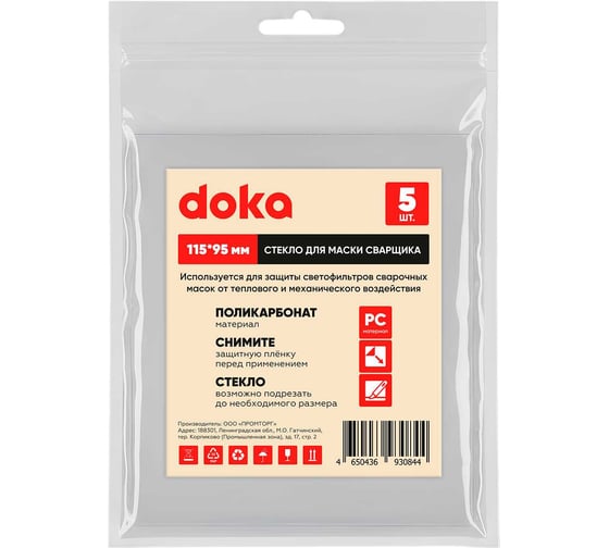 Защитное стекло doka изготовлено из высококачественного пластика - поликарбоната. Обеспечивает 100% защиту светофильтра маски сварщика от попадания искр, брызг металла снаружи и механического воздействия изнутри.