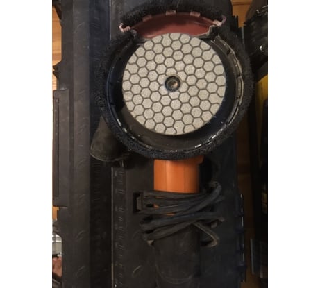 Кривая сборка изделия: плоскость А непараллельна плокости Б на 2 мм (см. фото). При установке насадки на болгарку Pro-Craft PW2350 кривая плоскость Б равномерно упирается в винты болгарки и фиксируется с отклонением от перпендикулярности к оси инструмента. Результат: вращающийся инструмент изнашивает внутреннюю часть насадки.