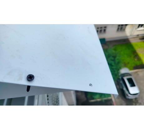 Верхний лист с торца помят, эмаль отлетела. Запакован отлично, явно с таком виде и запечатали. Для крепления верхнего листа к боковым угловым креплениям, лежат четыре винтика с гайками. Хотя отверстия в боковый крепежах под саморез сделаны... И их 8 отверстий. Может это и мелочь, но за 4 косаря это "шляпа".
