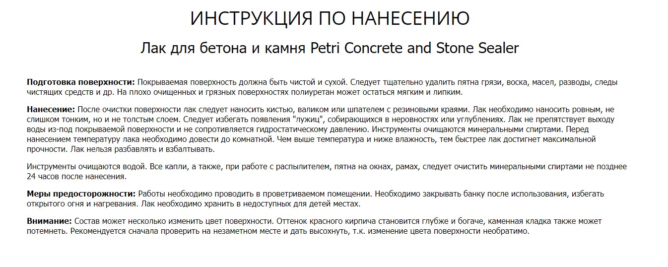 Для пористых поверхностей ОБЯЗАТЕЛЬНО использовать матовый лак по бетону и камню только в качестве финишного слоя, а первичным слоем нанести глянцевый лак по бетону и камню, в противном случае поверхность может принять белый оттенок.