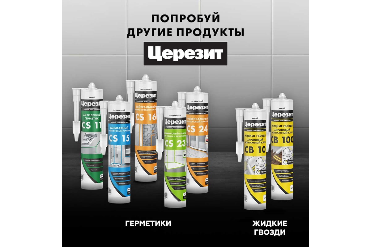 Затирка для швов Церезит CS 25 эластичная, силиконовая, с антигрибковым эффектом, жасмин 280мл 3000424 предназначена для герметизации угловых, деформационных и примыкающих к санитарно-техническому оборудованию (ваннам, раковинам и др.) швов плиточных облицовок в помещениях с повышенной влажностью: ванных комнатах, душевых, кухнях, туалетах и т.д.