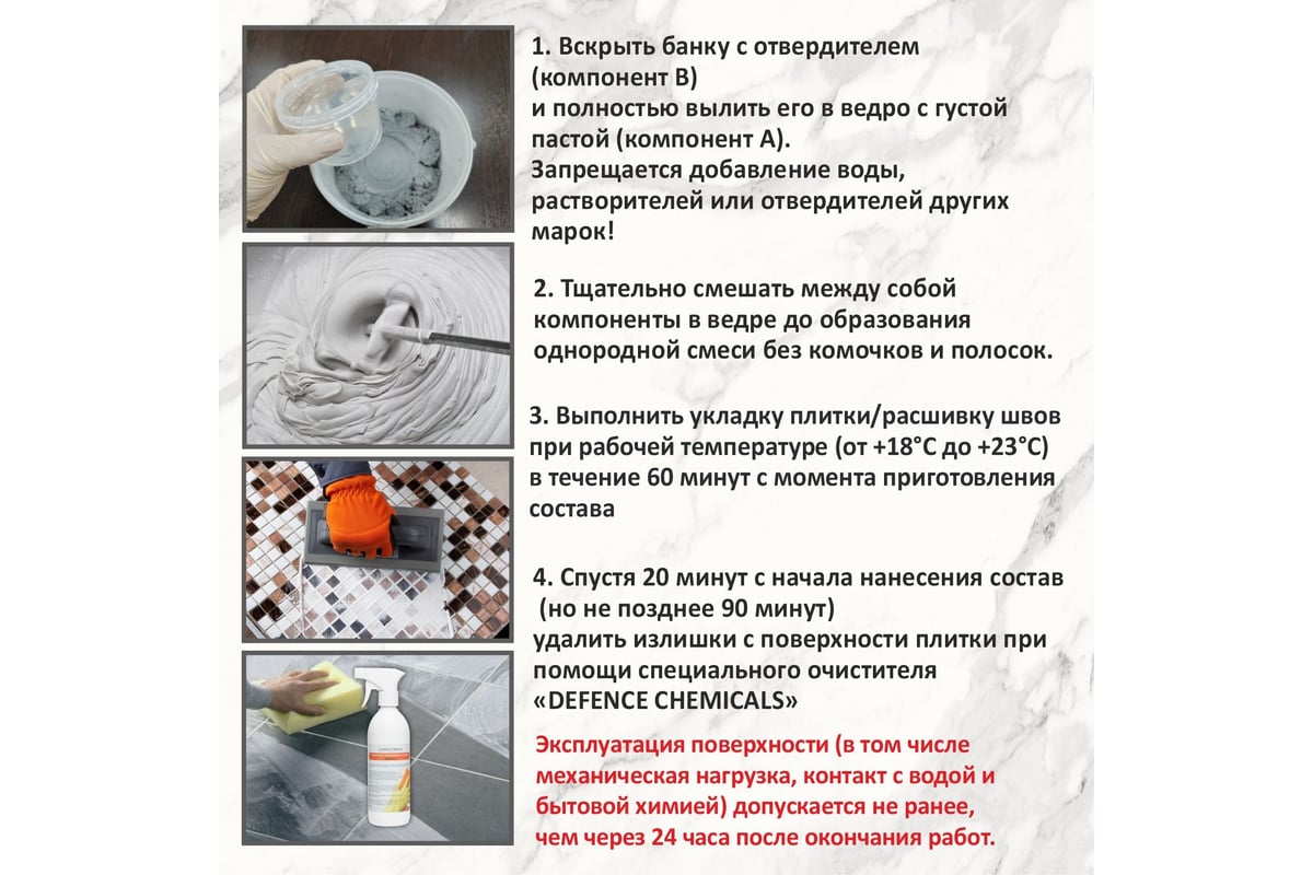 Откройте для себя новый уровень защиты и надежности с эпоксидной затиркой DEFENCE CHEMICALS ДИФЕНС-ЭЗ-1. Этот продукт – двухкомпонентная формула, обеспечивающая надежное заполнение и защиту межплиточных швов различных поверхностей, включая керамогранит, мозаику, мрамор, натуральный камень, керамические и кислотоупорные плитки.
