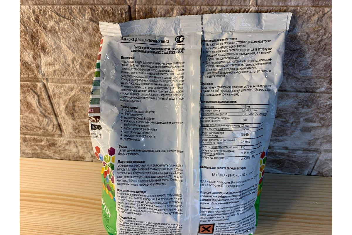 Во избежание различия оттенков швов, рекомендуется на одной плоскости использовать затирку одной партии. В течение 24 часов после заполнения швов затирку необходимо предохранять от пересыхания, а в течение 7 дней - от контакта с водой.