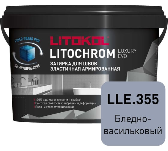 LITOKOL LITOCHROM LUXURY EVO LLE 355 бледно-васильковый 2 кг 500580002 - эластичная водоотталкивающая цементно-полимерная затирка с защитной системой LitoProtect для заполнения межплиточных швов шириной 1–10 мм включительно. Предназначена для затирки швов керамической плиткой, стеклянной мозаикой, керамогранитом, натуральным камнем, агломератом.