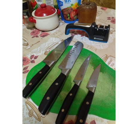 Пока алмазное покрытие новое - неплохо точит ножи. Металлическая ось заточных роликов. Довольно удобная по хвату конструкция. Прорезиненная подошва.