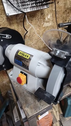Круги «садятся» на фланцы. Не на упорные шайбы и вставки внутри круга, а на 2 нормальных фланца с площадкой 8 мм. Т.е. круги 20 мм толщиной тоже зажать можно. Отверстие во фланцах ровно 16 мм. Сами валы двигателя не «бьют», но имели следы краски. Видимо, когда финишная окраска делалась, валы не были защищены. Пришлось мыть растворителем. Диаметр валов 15,9 и 15,87 мм. Фланцы при посадке имеют люфт. Для домашних работ несущественно, но если ставить алмазную чашку, то придется повозиться. Сами круги приличного качества. Мелкий (60) даже балансировки не потребовал. Грубый (36) пришлось балансировать. Геометрия кругов хорошая. Защитные кожухи кругов сделаны из нормального металла, не фольга. Но, не имеют внизу отверстий для высыпания отработанного абразива. Насверлил. Подручники не гнутся, но площадка маленькая. Станок отработал 20 минут при малых нагрузках (заточка сверл). Корпус нагрелся до 62 градусов. В районе подшипников нагрева нет. Мощности для домашних работ хватает. Лампу для него докупил. Стало совсем хорошо. Для дома – больше чем достаточно.