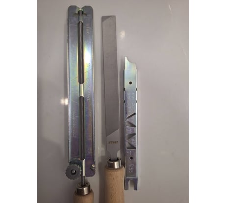 **Заточной набор** состоит из **зажимной державки с круглым напильником, плоского напильника и калибра в прочном футляре**.