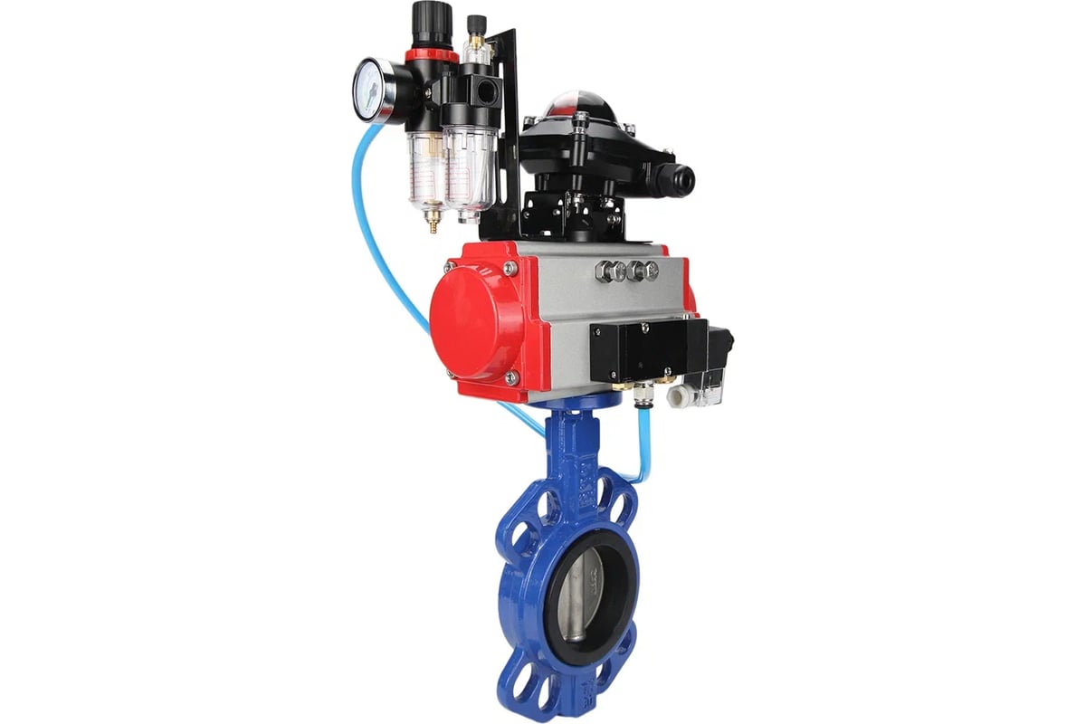 Затвор дисковый поворотный DN.ru 316L-316L-PTFE с пневмоприводом DA-140, пневмораспределителем PND2-S1EM-52-1NC-J08-220VAC, БПВ APU1-10-40-V08, БКВ LSB-510-02ExM12-250.