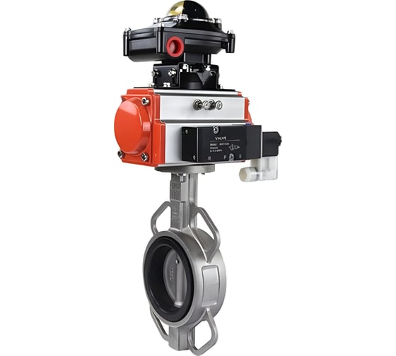 Затвор дисковый поворотный DN.ru 316L-316L-VITON с пневмоприводом SA-130, пневмораспределителем PND2-S1EM-52-1NC-J08-24VDC, БКВ LSB-410-02ExM12-250.