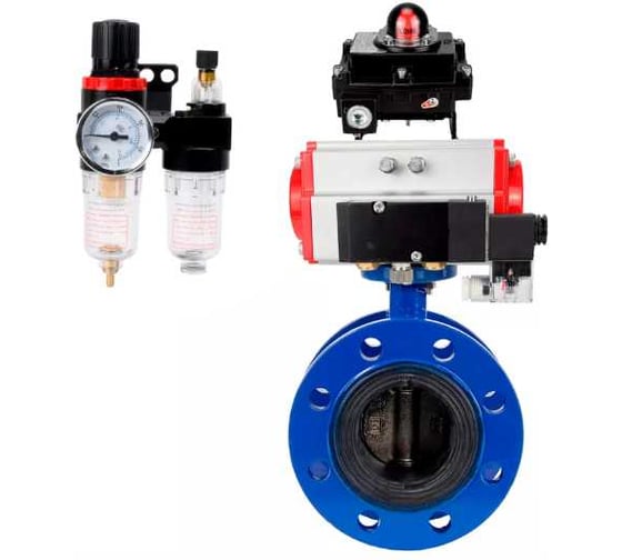 Затвор дисковый поворотный DN.ru GGG40-304-EPDM-2W-F предназначен для использования в качестве запорной или регулирующей арматуры для управления потоками в системах теплоснабжения, водоснабжения, в технологических процессах пищевой, химической, нефтегазовой, целлюлозно-бумажной и других отраслях промышленности. Затворы открываются и закрываются путем поворота диска на 90°. Открытие производится поворотом рукоятки против часовой стрелки, закрытие - по часовой стрелке. Приводы пневматические DN.ru поворотные двойного действия PA-DA-XXX и приводы пневматические поворотные с возвратной пружиной PA-SA-XXX предназначены для автоматизации процесса управления промышленной арматурой при максимальном значении крутящего момента до 2128 Нм. Пневмораспределители используются для управления в пневмосистемах, имеющих стыковочную поверхность NAMUR, для установки распределителей через сквозные отверстия в корпусе. Блок концевых выключателей – это электротехническое устройство, предназначенное для размыкания и замыкания рабочей цепи и для визуализации положений запорного органа трубопроводной арматуры. Блок подготовки воздуха предназначен для очистки сжатого воздуха от капельной влаги и твердых частиц, удаления конденсата, автоматического поддержания величины давления на заданном уровне, подвода смазочного материала из резервуара в поток сжатого воздуха к элементам пневмосистемы.