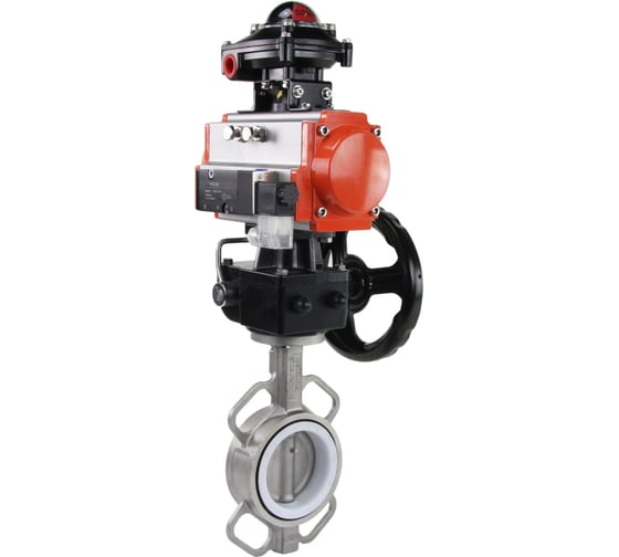 Затвор дисковый поворотный DN.ru 316L-316L-PTFE с пневмоприводом SA-105, пневмораспределителем PND2-S1EM-52-1NC-J08-220VAC, БКВ LSB-210-02NM12-220/24, ручным дублером HDM-3.