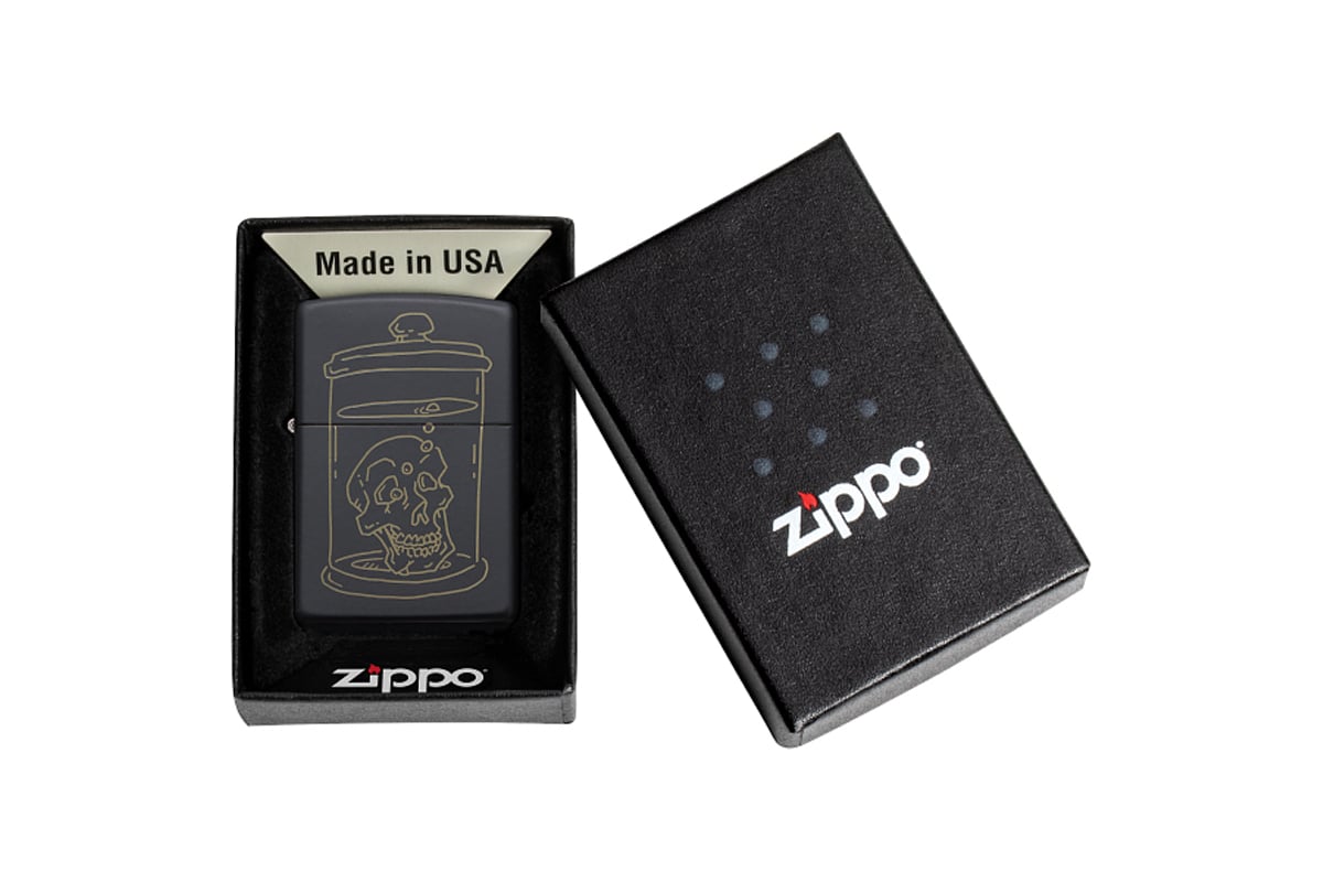 Зажигалка ZIPPO Skull Design с покрытием Black Matte, латунь/сталь, чёрная матовая, 38x13x57 мм 49575 подходит для личного пользования, а также приобретения в качестве подарка.