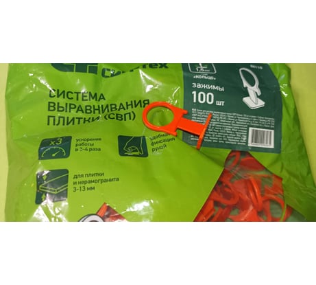 Система выравнивания плитки Сибртех СВП Кольцо 88110 состоит из зажимов (100 шт. в пакете), используемых совместно с клиньями. Позволяет добиться качественного результата: межплиточные швы получаются ровными и аккуратными, керамическая/керамогранитная плитка не смещается. Зажимы предназначены для формирования швов шириной 1,5 мм. Клинья приобретаются отдельно (артикулы 88050, 88071).