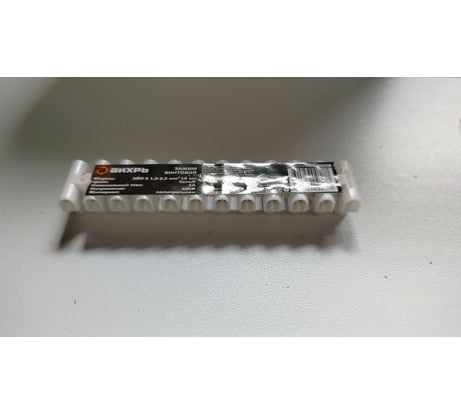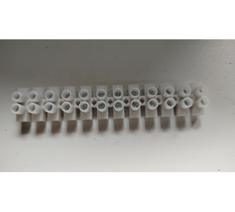 Зажим винтовой Вихрь ЗВИ-3 1,0-2,5 mm?, 12 пар 73/12/3/1. Твердый, слегка колючий белый пластик с острыми уголками (заявлен полипропилен с температурным режимом от -20 до +100 градусов), в меру жесткий, в меру мягкий, винты фиксируют надёжно, ничего не болтается и не вылетает. Под провод от 1 до 2,5 кв.мм, ток в 3А и напряжение до 400В Разрезал/разделял канцелярским ножом, расстояние между дырочками крепления 8мм., винт под шлицевую, плоскую отвертку.