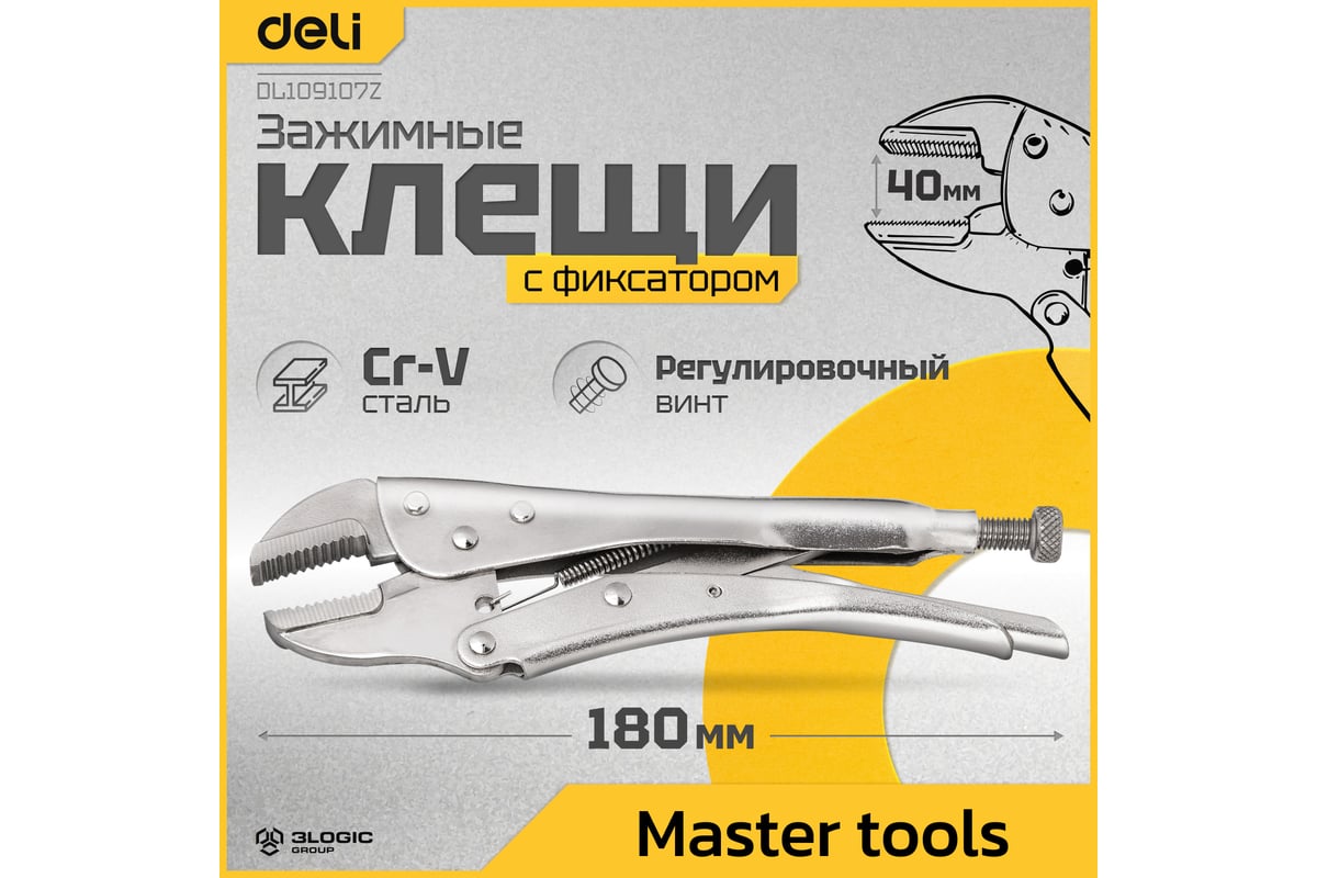 Зажимные клещи DELI с изогнутыми губками с фиксатором регулируемые DL109107Z 180мм рабочий ход 40мм, CrV 110708