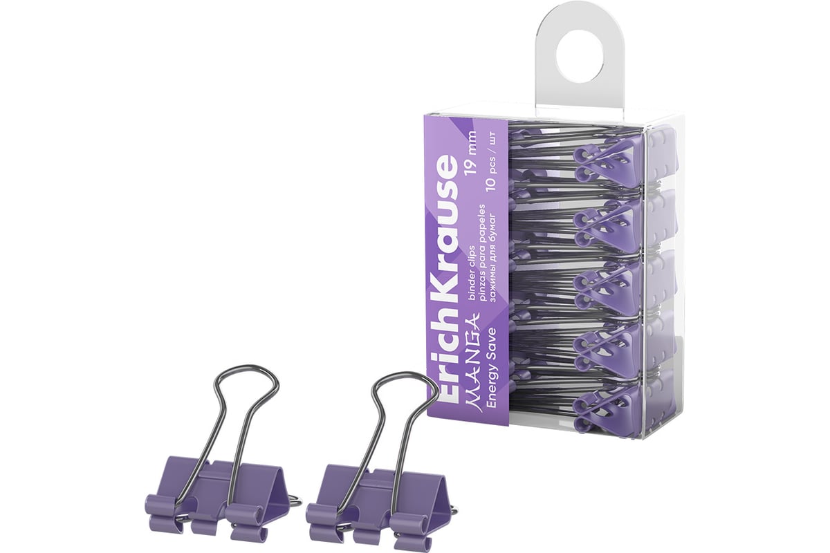 Зажимы для бумаг ErichKrause Energy Save Manga, 19 мм, Lilac в пэт-боксе по 10 шт 62065