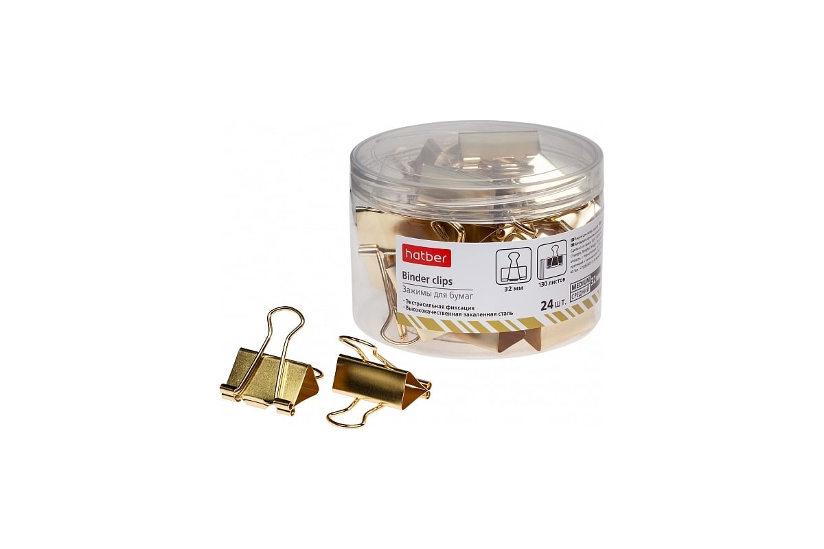Зажимы для бумаг Hatber 32 мм, золотые, 24шт, в пластиковой тубе 059169