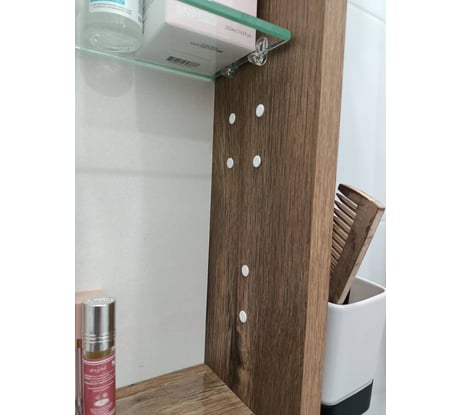 С маленьким ростом не очень удобно смотреть в зеркало из-за нижней полки. Нет ручки на дверце, остаются пятна от пальцев.