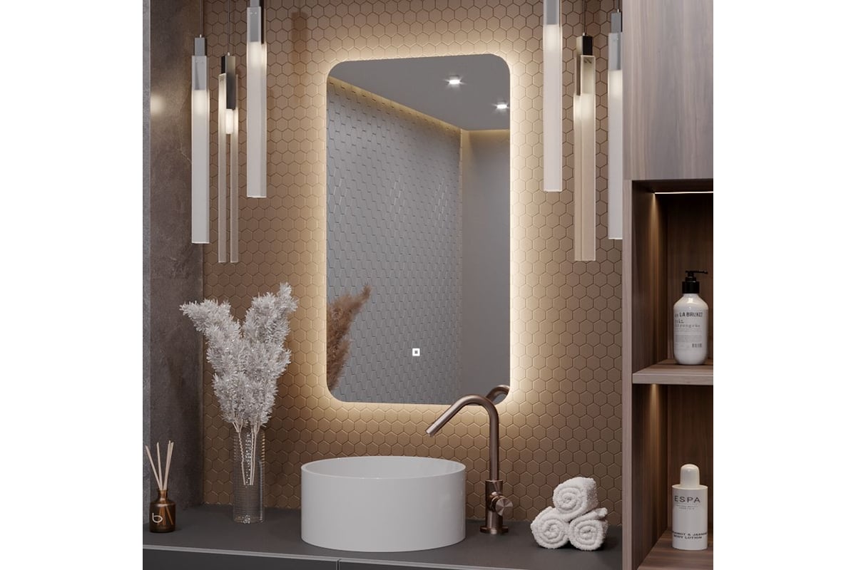 Зеркало с подсветкой в ванную "парящее". Сенсорный выключатель с белой индикацией кнопки и диммером (регулировка яркости длительным нажатием на кнопку) расположен снизу по центру.