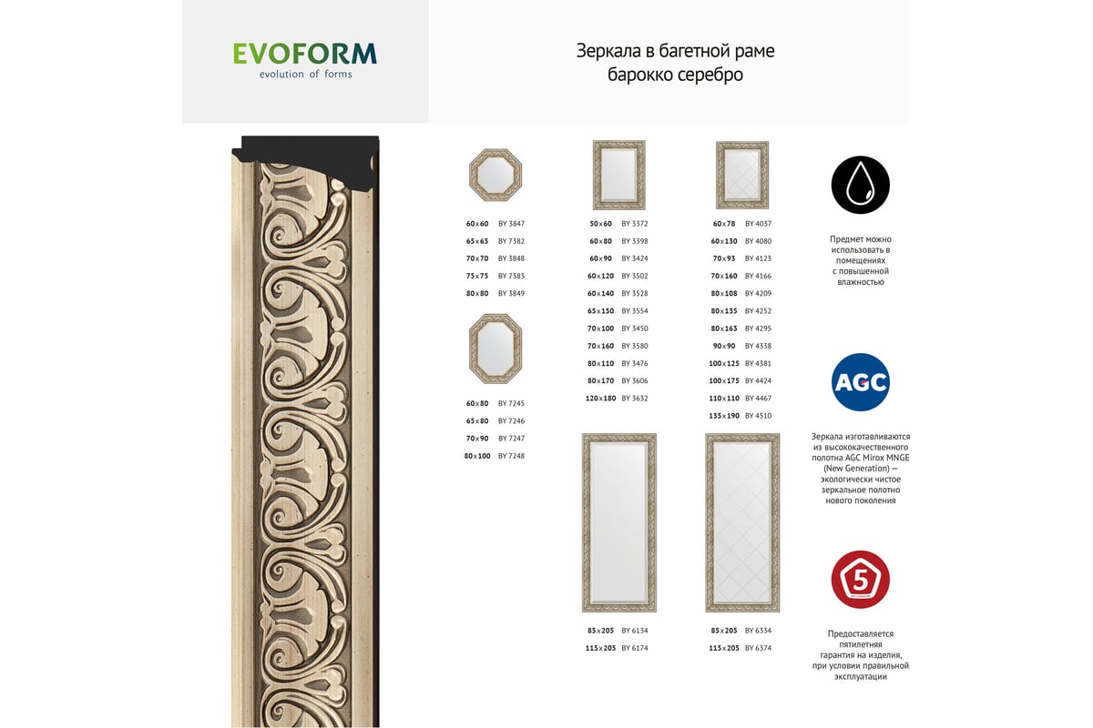 Зеркало EVOFORM с фацетом в багетной раме - барокко серебро 106 мм (70x160 см) BY 3580 изготовлено из высококачественного полотна AGC Mirox MNGE (New Generation) — экологически чистого зеркального полотна нового поколения. Зеркальное полотно состоит из стекла и нанесённого на одну из его поверхностей отражающего слоя: тонкого, равномерного металлического покрытия — амальгамы, защищённого лакокрасочным покрытием. В качестве отражающего слоя используется серебро. Серебряные зеркала - влагостойкие и не боятся коррозии, поэтому подходят для помещений с повышенной влажностью.