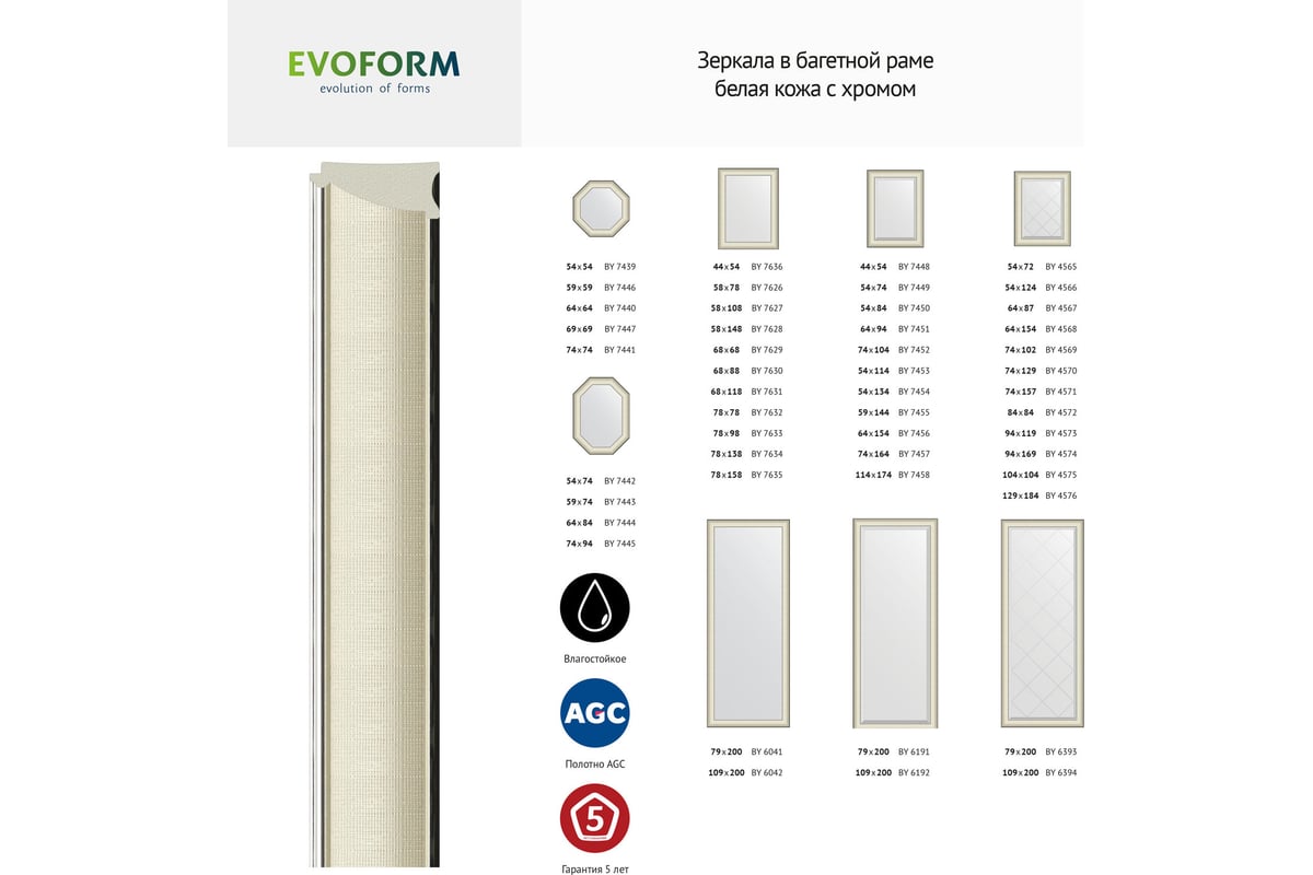 При изготовлении зеркал торговой марки Evoform используются серебряные зеркальные полотна мирового производителя AGC- Asahi Glass Co (Япония).