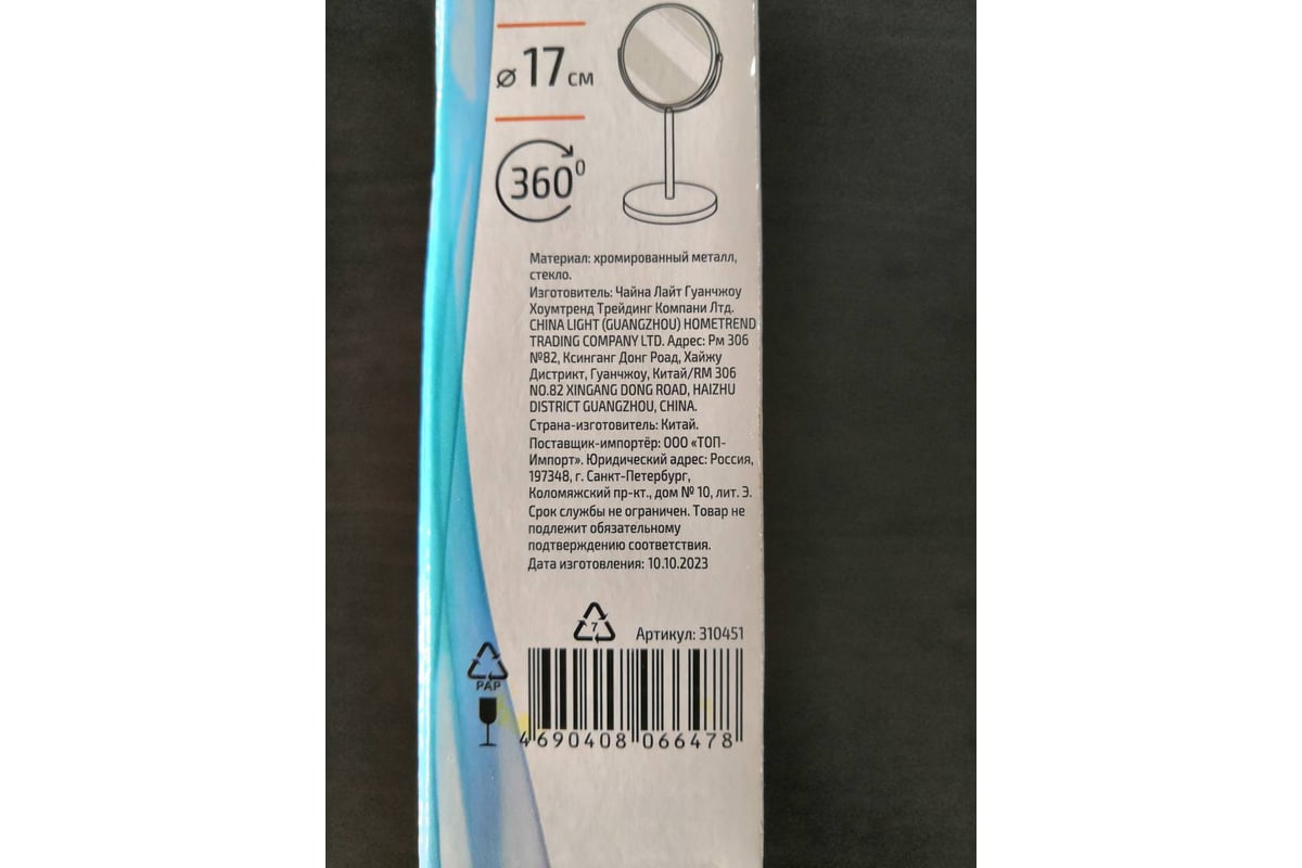 Настольное двустороннее зеркало в оправе из хромированной стали имеет влагостойкое покрытие и регулятор наклона. Оно будет удобным в ванной комнате или на туалетном столике. У зеркала две поверхности, одна из которых дает обычное отражение, другая с 5 - кратным увеличением.