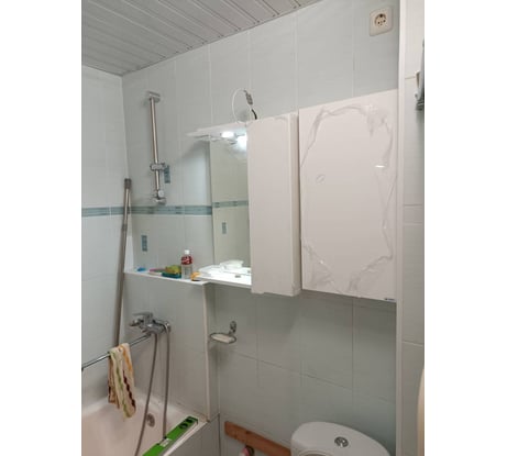 - Широкое зеркало сбоку от шкафчика. Под ним есть узкая полочка для полезных вещей.