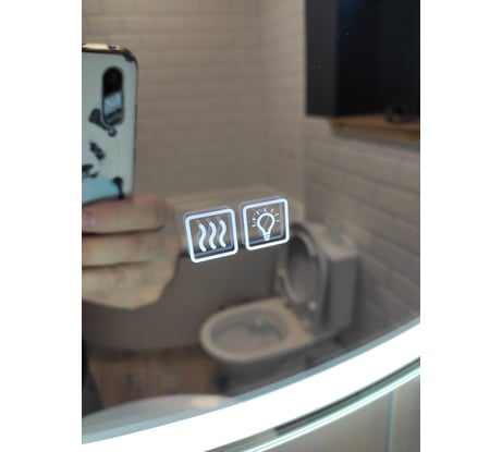 Размер в диаметре 80 см толщина 3 см, само зеркало наверно 4мм, задняя часть закрыта пластиком, крепеж в комплекте, кнопки всегда подсвечиваются синей подсветкой, при включении светятся белым. Сложно пока говорить про обогрев- нет возможности проверить все ли зеркало подогревается.
