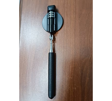 Прорезиненная ручка. Вполне прочный и без люфта металл телескопа. Поворачивающееся зеркало с подсветкой. Достаточно мощный магнит. Зеркало снимается. Подсветка светит туда куда направлено зеркало за счет призмы. Подсветка включается и выключается передергиванием корпуса фонаря как затвор на карабине. Изготовлено в целом качественно.